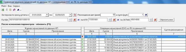 - ➜ В операцию сравнения журнала начислений по данным НП (налогоплательщика) с операциями ЕНС из ЛК по данным НО, кроме выбора по КБК, добавлены еще параметры отбора операций по КПП и ОКТМО для подразделений налогоплательщика.