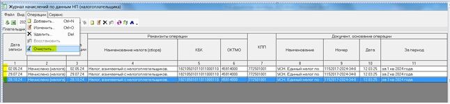 - ➜ В Журналах начислений и уплат доработана операция «Очистить»: реализована возможность удалять только текущие данные, отображаемые в журнале (т.е. видны в списке) с учетом выбранного года и установленного фильтра.