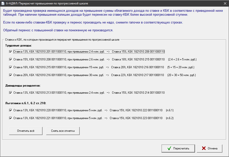 В Баланс-2W/Н помимо возможности внесения сумм доходов каждого физического лица, облагаемых по различным ставкам, дополнительно реализована возможность автоматического распределения введенных данных в соответствии со шкалой ставок налогообложения. Если все доходы были отражены по минимальной ставке, то при пересчете программа сама разнесет такие суммы в соответствии с действующей шкалой – в минимальной ставке останется максимальная для нее сумма дохода, а превышение будет перенесено в следующие по шкале ставки и заполнит соответствующие им КБК. При этом останется возможность вручную указывать, для какого порога шкалы производить перенос.