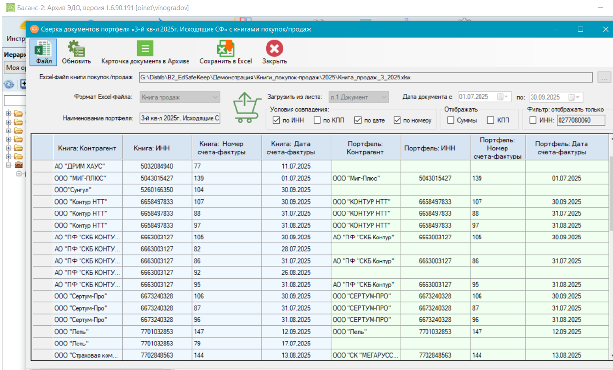- Кроме того, в программе «Баланс-2: Архив ЭДО» реализована возможность сверки книг покупок и книг продаж в Excel- или XML-файлах приложений 8 и 9 к декларации по НДС, сформированных в своих бухгалтерских программах, с документами УПД или счетами-фактурами из системы Диадок.
