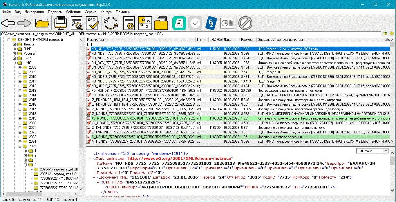 - И, наконец, напомним о возможностях программы «Баланс-2: Файловый архив электронных документов» (Б2: ФАЭД) при работе с файлами деклараций по НДС, книг покупок и книг продаж, журналами счетов-фактур, реестрами документов по НДС. Б2: ФАЭД позволяет определять и проверять формат файлов по xsd-схеме, определять «назначения» файлов и их электронных подписей, формировать печатные формы документов со сведениями об электронных подписях.